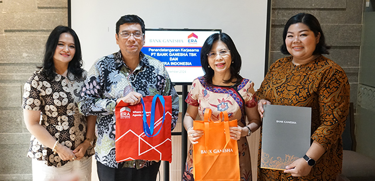 Jumat 6 September 2024, PT Bank Ganesha Tbk dan PT Era Graharealty Tbk meresmikan kerjasama referral untuk pembiayaan KPR yang dilaksanakan di Kantor Pusat Bank Ganesha di Wisma Hayam Wuruk, Jakarta Pusat. ERA Indonesia merupakan perusahaan waralaba dan
